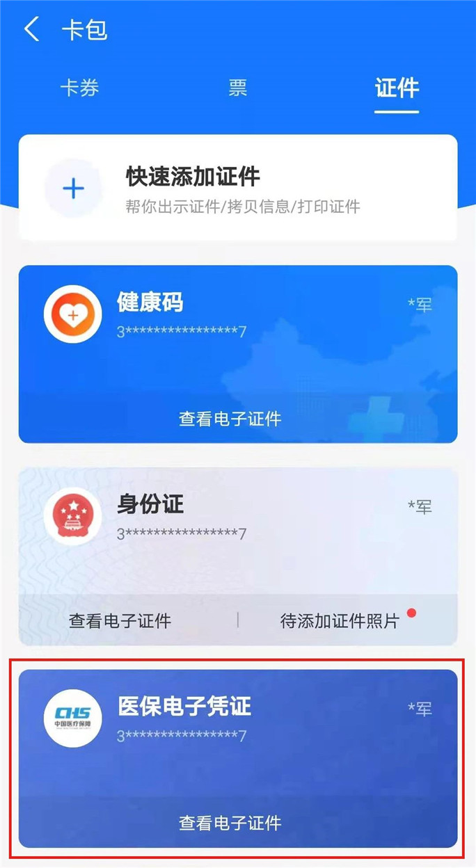 在卡包版塊點(diǎn)擊右上角“證件”按鈕切換到卡包證件界面,點(diǎn)擊“+添加證件”添加“醫(yī)保電子憑證”