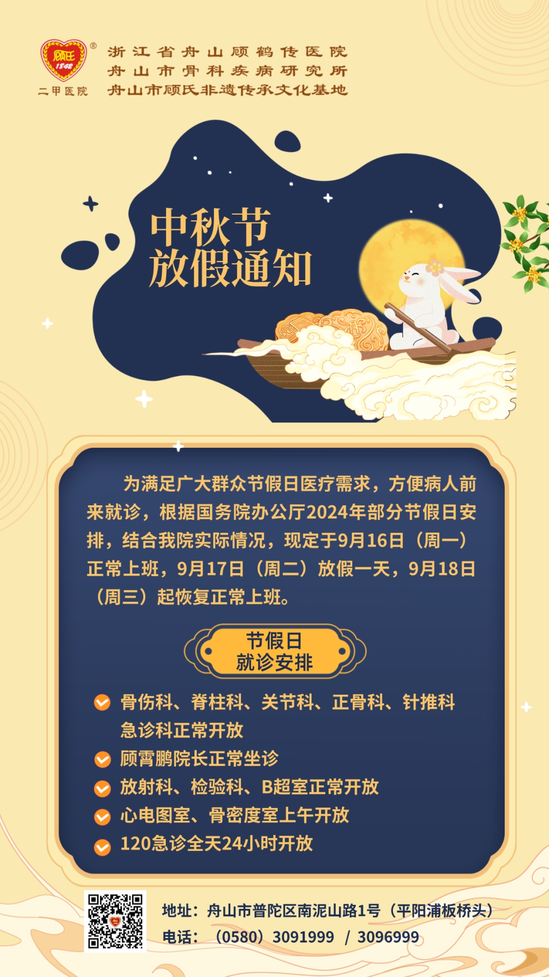 廣大市民朋友,根據(jù)國(guó)務(wù)院部分節(jié)假日放假通知,結(jié)合我院實(shí)際情況,2024年中秋節(jié)假期門診安排如圖,請(qǐng)相互轉(zhuǎn)告,并合理安排好您的就診時(shí)間,如有不便之處敬請(qǐng)諒解!