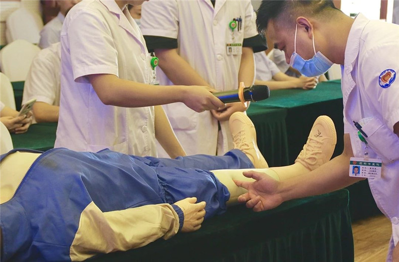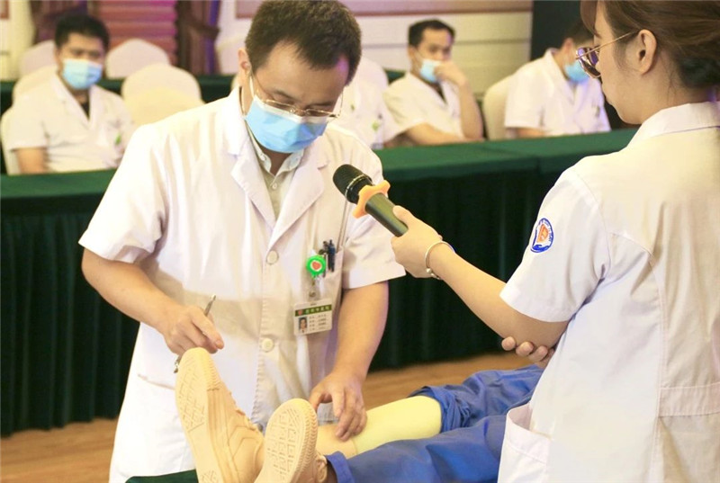 本次大賽活動(dòng)環(huán)節(jié)共有兩大項(xiàng),第一項(xiàng)為“臨床技能操作考核”??己藘?nèi)容分病史采集、體格檢查、首次病程錄書寫、病歷書寫、臨床思維與決策、基本技能操作(心肺復(fù)蘇、氣管插管)和專科技能操作(骨科)。每個(gè)臨床科室派兩位醫(yī)師參加技能考核,采取隨機(jī)抽題的形式,現(xiàn)場(chǎng)操作演示并作答。
