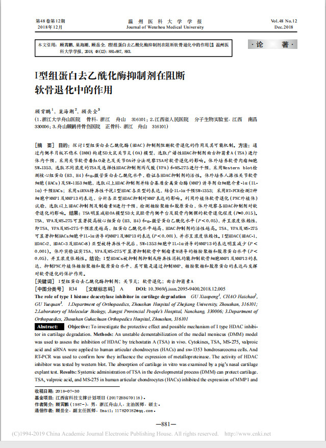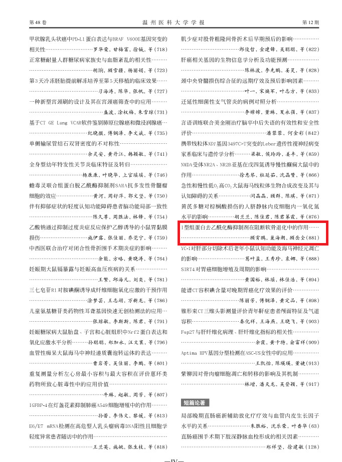 由我院掌門人顧岳全、顧霄鵬等撰寫的論文《I型組蛋白去乙?;敢种苿┰谧钄嘬浌峭嘶械淖饔谩吩谥袊萍己诵钠诳?、中國高校優(yōu)秀科技期刊《溫州醫(yī)科大學(xué)學(xué)報(bào)》2018年48卷第12期上發(fā)表。