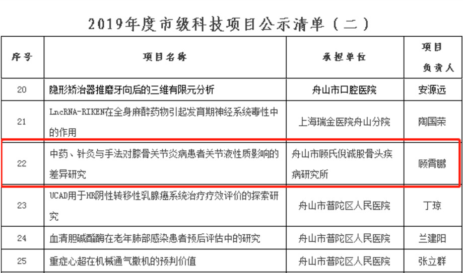 我院顧霄鵬副院長負(fù)責(zé)的《中藥、針灸與手法對膝骨關(guān)節(jié)炎病患者關(guān)節(jié)液性質(zhì)影響的差異研究》被納入2019年度舟山市市級科技項(xiàng)目。