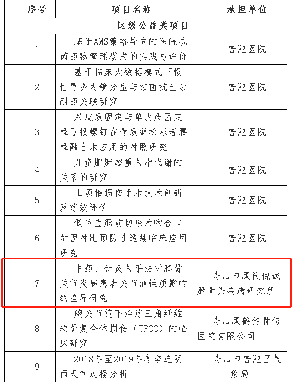 我院《中藥、針灸與手法對(duì)膝骨關(guān)節(jié)炎病患者關(guān)節(jié)液性質(zhì)影響的差異研究》被納入2019年度舟山市普陀區(qū)科技項(xiàng)目。