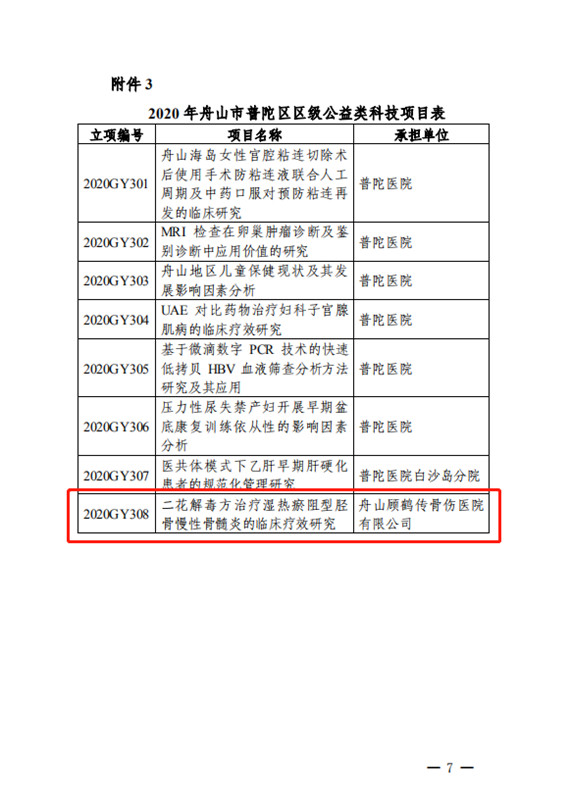 我院的《二花解毒方治療濕熱瘀阻型脛骨慢性骨髓炎的臨床療效研究》被納入2020年度舟山市普陀區(qū)區(qū)級公益科技項(xiàng)目。