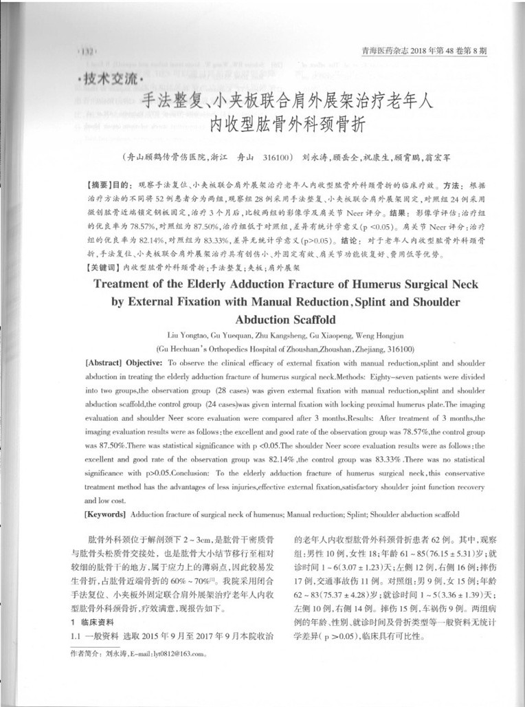 由我院掌門人顧岳全、顧霄鵬、劉永濤、??瞪?、翁宏軍等撰寫的論文《手法修復(fù)、小夾板聯(lián)合肩外展架治療老年人內(nèi)收型肱骨外科脛骨折》在國家核心期刊《青海醫(yī)藥雜志》2018年第48卷第8期上發(fā)表。